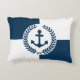 Nautisches Design mit Anker- und Lorbeerkraendekoration über blau-weißem geometrischem Hintergrund