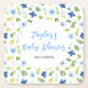 This beautiful and elegant coaster features watercolor baby blue and navy blue flowers with foliage. The text combines handwritten script and serif fonts for a stylish and modern look. This is perfect for a spring or summer rustic baby shower.