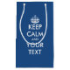 Navy Blau und Weiß Behalte Ruhe und Ihre Text Geschenktasche für Geschenke und Favoriten. Machen Sie Ihren eigenen lustigen behalt ruhig und führen Sie Parodie-Slogan. Vintages Template Design mit Keepcalmandarryon Typografie und Krone. Elegante, ruhige Taschen zum Geburtstag, Brautparty, Hochzeitsfeier, Weihnachtsfeiertag, Babydusche etc. Niedliche farbenfrohe Beispiele: Behalt Ruhe und Party auf. Behalt Ruhe und Liebe für mich. Behalt dich ruhig und unterhalte dich. Kleine und große Größen plus Taschen für Weinflaschen. Benutzerdefinierte Hintergrundfarben.