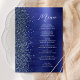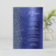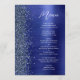 Dieses elegante moderne Hochzeitsmenü enthält einen falschen Diamantglitterrahmen auf einem navy-blauen, gebürsteten Metallhintergrund. Der anpassbare Text kombiniert weiße Handschrift und serifenlose Schriftarten. Das navy-blaue gebürstete Metall- und Glitterdesign wird auf der Rückseite wiederholt.