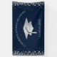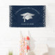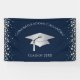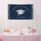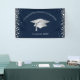 This modern design features a graduation hat and confetti in silver on a background of navy blue with white text.