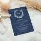 Ideal für Hochzeiten am Strand und Wassersport, ein Korallenkreat umrahmt die Monogramme der Braut und des Bräutigams oben auf dieser eleganten marineblauen Einladung mit weißem Text.