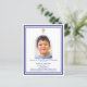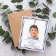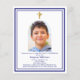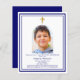 Weißer Hintergrund, mit einem marineblauen Rahmen dekoriert, goldenes Kreuz Persönlich gestalten und ein Foto mit Details hinzufügen. Navy Text. Bogenförmiger Rahmen aus Foto Zurück: marineblau Farbe. 1 Blatt = 1 Einladung mit Druckkante bis Kante.