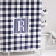 Moderner Duschvorhang mit personalisiertem Monogramm auf marineblauen Büffel-Karo.