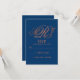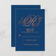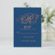 Diese elegante RSVP-Karte hat ein verflochtenes Monogramm in Skript-Schriftart in Kupfertönen auf marineblarem Hintergrund. Die Rückseite ist in marineblau.