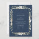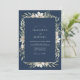 Deep navy blue provides a sophisticated backdrop for this design, which features a delicate arrangement of white anemones and sage green leaves. The crisp contrast of watercolor florals creates a serene and timeless aesthetic. This botanical artwork offers a classic and refined look suited for a formal winter event.