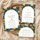 A rich and sophisticated floral design featuring deep navy tones accented with warm golden blooms, framed within a timeless arched layout. The contrast between the dark background and soft ivory center creates a striking, high-end aesthetic that feels both modern and classic.