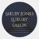 Dieser schicke Luxus-Salon Business-Aufkleber bietet Ihnen Ihre Firmeninfo in eleganter Typografie auf dem schicken marineblau-blau und goldgestreiftem Hintergrund. Das Design erinnert an Vorhänge, die hinter dem weißen Text erscheinen. Passen Sie diese Labels mit Ihrem Firmennamen an, um ein modernes Mailing-Accessoire zu erhalten.