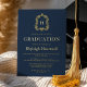 Navy Blue Gold Monogram Wappen Graduation Party Folieneinladung