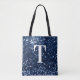Ein modernes, fett gedrucktes Single-Monogramm in Weiß mit einem schwarzen Schlagschatten. Die Größe, die Farbe und der Stil des Schriftartes sind individuell einstellbar. Der Hintergrund ist ein Imitat dunkelmarineblau Glitzer mit funkelnd Flecken oder Buch. Verschieben oder löschen Sie die kleinen Imitate funkeln grafische Bilder. Mädchen schick Geschenk für eine Brautjungfrau oder ein anderes Mitglied Ihrer Hochzeitsfeier.