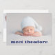 Diese moderne minimalistische Ankündigung ist der perfekte Weg, um Ihren Neugeborenen Ihrer Familie und Freunden vorzustellen. Das schlichte Design in Marineblau und Weiß ist mit einem großen Foto Baby mit MEET und dem Vornamen des Babys in Marineblau ausgestattet, während der Rücken eine drei-Foto-Collage mit dem vollständigen Namen des Babys, dem Geburtsdatum, den Geburtsstatistiken und den Eltern-Namen hat.