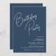 Moderne minimale Geburtstagseinladungen mit "Birthday Party" in einem handgeschriebenen Schriftart. Weißer Text auf dunkelblauem Hintergrund. Lässige Geburtstagsparty lädt ein, die auf jedes Alter umgestellt werden können.