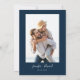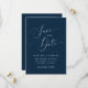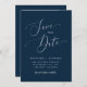 Moderne und minimale Save the Date Karte mit einem eleganten Skript, das "Save the Date" auf marineblau Hintergrund in der Mitte mit den kurzen Informationen über die Hochzeit. Sie können ein Foto auf der Rückseite hinzufügen.