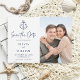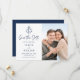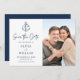 Diese elegante marineblaue Hochzeit speichert die Dattelkarte ein Ankermonogramm über dem Text, eine stilvolle Handschrift für die "Save the Date" Ankündigung, und ein Foto des glücklichen Paares.
