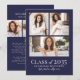 A simple and elegant boho-inspired graduation announcement featuring photo collages on both the front and back for a personalized touch. The front showcases three photos arranged in a clean collage format, framed by an elegant border with navy blue backgrounds and white text beneath. “Class of 2026,” the graduate's name, and school are displayed in understated, sophisticated fonts.