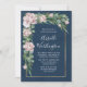 Das Aquarium ist mit einem silbernen Panzer und einem Eukalyptus-Samen versehen, der auf einem marineblauen Aquarellhintergrund mit einer goldenen Grenze aufgetragen wird. Das Design besticht durch elegante Blumenelemente von Rose und Pfannkuchen in staubiger Rose oder rosa Blütenpracht.