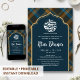 A masculine and classic design featuring a navy blue and gold plaid pattern surrounding a traditional arch frame. Perfect for a formal men’s Iftar or a professional corporate breaking fast event. This printable and instant download is easy to edit.