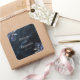 These elegant wedding stickers feature the couple's names in silver gray italics, joined by word "and" in silver gray handwriting calligraphy with swashes at the beginning and end. Add the wedding date below in serif font. A pair of navy blue floral bouquets set off with silver faux foil foliage appear in two corners, on a background image of dark navy blue watercolor agate. See our collection for matching wedding invitation suite and day-of stationery.
