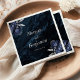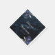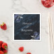 These elegant wedding napkins feature the couple's names in silver gray italics, joined by word "and" in silver gray handwriting calligraphy with swashes at the beginning and end. Add the wedding date below in serif font. A pair of navy blue floral bouquets set off with silver faux foil foliage appear in two corners, on a background image of dark navy blue watercolor agate. See our collection for matching wedding invitation suite and day-of stationery.
