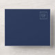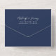 The left-hand edge of this elegant modern all-in-one wedding invitation and RSVP features a silver faux glitter border. The customizable text combines silver gray whimsical handwriting, copperplate and italic fonts on a navy blue background. The return address appears on the outside flap and the reverse side of the detachable RSVP card in silver gray text on solid navy blue. A QR code is included on the RSVP card for guests who would prefer to reply online.