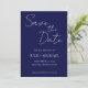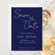 Einfache Hochzeit im Stile rette den aktuellen Einladungen, die mit einem weißen, stilisierten Skript auf einem trendigen, navy blauen Hintergrund versehen sind. Bearbeiten und ersetzen Sie Namen, Datum und Position mit Ihrem eigenen. Wählen Sie Ihre Einladungsgröße und Ihren Papierstil aus.
