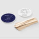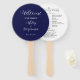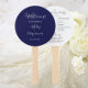 Hochzeitstag-Programm gedruckt auf einem runden Handventilator, der einen trendigen, marineblau blauen Hintergrund auf der Vorderseite mit Braut- und Bräutigamen in weißem, stilisiertem Skript aufweist. Auf der Rückseite des Programms sind die Teilnehmer der Hochzeitsfeier und die Zeremonie-Rites auf weißem Hintergrund mit dunkelgrauer Schrift aufgeführt. Bearbeiten Sie den Handventilator und ersetzen Sie die Informationen zum Hochzeitsprogramm durch Ihre eigenen. Ideal für eine Hochzeitsfeier im Innen- oder Außenbereich! Wählen Sie die gewünschte Anzahl von Hand-Lüfterprogrammen aus.