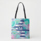 Diese einzigartige und hübsche Tasche zeichnet sich durch ein wunderschönes aquamarines Grün, Gold, Rosa und Weiß-Muschelmuster aus, das unter einem marineblauen Streifen-Hintergrund verlegt wurde. In der Mitte befindet sich Ihr Monogramm in weiß und auf einem halbtransparenten marineblau kreisblauen Banner platziert. Die Rückseite der Tasche hat das gleiche Muschelmuster, aber ohne Banner oder Monogramm.