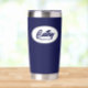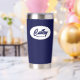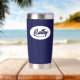 Verschenken Sie Ihre Hochzeitsjury mit diesem trendigen und personalisierten, rostfreien Edelstahl, Thermalwäscher mit ihrem Namen in stilisierter Schrift in einem weißen ovalen Design. Hintergrundfarbe und Skript ist eine marineblau Farbe. Personalisieren Sie Ihren Wärmeleiter, indem Sie den Namen der Brautjungfrau mit dem gewünschten Namen bearbeiten und ersetzen. Erhältlich in vielen beliebten Hochzeitsfarben.