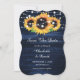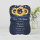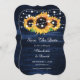 Rustikale Hochzeit in marineblau und Sonnenblumen speichern die Dattelkarten mit Sonnenblumen auf einem Holzboden, der mit Saitenlichtern geschmückt ist. Zwei Höllenherzen am Rücken. Matching-Elemente verfügbar.
