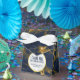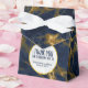 Eine personalisierte Gastgeschenk Hochzeit mit stilvollem und elegantem Hintergrund aus Marineblau und Goldmarmor. Oben platziert ist ein Kreis mit einem Imitat, der eine goldene Folie mit dem personalisierten Text enthält.