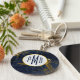 Ein Schlüsselanhänger mit stilvollem und elegantem Hintergrund aus Marineblau und Goldmarmor. Oben platziert ist ein Kreis mit einer goldenen Folienabdeckung in Imitaten, in der sich das personalisierte Monogramm befindet.