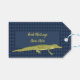 Erstellen Sie benutzerdefinierte Tags für Gastgeschenke oder fügen Sie Ihren Namen für personalisierte Geschenktags mit einer wilden Touch hinzu. Diese Papieretiketten zeigen eine realistische Darstellung eines Alligators in olivgrünem Set vor einem marineblauen gemusterten Hintergrund. Es gibt einen Platz über dem Gator, um eine eigene Nachricht in olivgrünem Schriftzeichen hinzuzufügen.