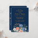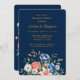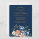 Ein Aquarellbild eines hellen Peronenbouquets in marineblau und orange. Das Bouquet besteht aus Pfannkuchen mit großen, runden Blüten und tiefgrünen Blätter. Der Hintergrund ist marineblau. Entsprechende Einladungen und Hochzeitslieferungen sind in dieser Kollektion erhältlich