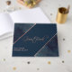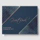 Elegantes Hochzeitsgast-Schild in Buch gemacht Marineblau, mit einem marineblau und Rose goldgelben Gittermuster Akzent. An der Vorderseite des Gästebuches befindet sich eine Rose aus goldfarbenem Metall mit grafischem Text, der das Gästebuch liest. Personalisieren Sie den benutzerdefinierten Text auf der unten links Vorderseite für Ihre Veranstaltung oder Ihre Bedürfnisse. Ideal für Hochzeiten, Geburtstage und jeden anderen besondere Anlass.