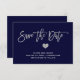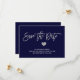 Diese elegante und skurrile Save the Date-Karte ohne Foto besticht durch Imitate, die in Silber aussehen, moderne Schrift-Typografie und ein romantisches, passendes Herz auf dunklem, marineblauen Hintergrund.