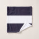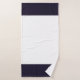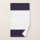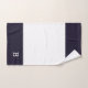 Navy blaues Monogramm Badetuch Set. Weiß mit weißem Blocktext-Monogramm auf einem marineblau-blauen und grauen Streifen.