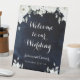 Ein dezent weißes und marineblau Willkommen bei Our Wedding 10 von zwölf Tischschildern mit einer zarten Aquarellfarbe mit weißen Toronenfloralen und Eukalyptusgrün am oberen Ende vor einem tiefen marineblauen Aquarell mit weißem handgeschriebenem Schriftzeichen, das die Gäste zu Ihrer Hochzeit einlädt.