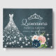 Sparkle Glitzer-Leuchten mit Diamantdruckkleid und Tiara und einem wunderschönen Blumenstrauß-Blumenstrauß über einem dunkelmarineblauen Chalkboard-Hintergrund, der ein elegantes, individuelles Gästebuch aus Quinceanera macht. +++++ Geeignet für Mädchen Herbst 15. Geburtstagspartys.