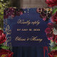 Eine bordeauxrote Hochzeitseinladung mit einer Sinfonie von tiefbordeaux-roten, mit Goldspray verzierter Konturen und glänzenden goldfarbenen versammelt sich um einen marineblauen Aquarellwaschuntergrund mit großen Namen in goldfarbener rustikaler Schrift mit einem großformatigen Schriftart, der Ihre Details ankündigt.