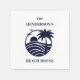 Add a touch of coastal charm to your gathering with these personalized family beach house paper napkins. This chic design features a palm tree and the sun rising above the ocean in elegant navy blue and white, set against a crisp white background. Perfect for a beach housewarming celebration, seaside get-together, or beach party, these stylish coastal napkins can be personalized with your family name to make your event feel extra special. A beautiful blend of seaside simplicity and sophisticated style for your beach home entertaining.
