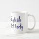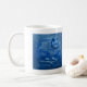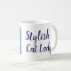 Weiße Tasse mit marineblauen Katzenkacheln, inspiriert mit Jugendstil-Fliesen und den Worten "Stilvolle Katze Lady". Der Text ist vollständig editierbar.