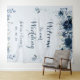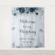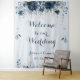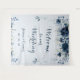 Eine marinierte und staubige blaue Aquarellblume Willkommen In Unser Tapisserie-Zeichen für Hochzeiten, das Ihre Gäste zu Ihrer Hochzeit vor einem marineblauen Hintergrund mit weißer Kalligraphie und numerischem Datum.