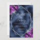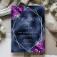 Diese elegante, moderne Hochzeitseinladung besticht durch einen silbernen geometrischen Rahmen, der mit lila und silberfarbenen Blumenbouquets auf dem Hintergrund der Imitate in Marineblau dekoriert ist. Der anpassbare Text kombiniert silbergraue, weißliche Handschrift, Kupferplatte und kursiven Schriftart.