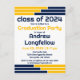 Senden Sie diese Navy & Gold Bars Graduation Party Einladung Postcard an Ihre Familie und Freunde. Personalisieren Sie die Angaben zum Namen, zum Unterrichtsjahr und zum Party Ihres Absolventen. Die Farben der Marine und der Goldschule laden zum Verweilen ein.