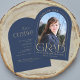 Diese einfache minimalistische, blaue und goldene Abschluss-Karte dient sowohl als Ankündigung des Abschlusses als auch als Party Einladung des Abschlusses und bietet ein Foto, einen Bogenrahmen und eine elegante moderne Typografie.