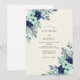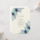 This design showcases a palette of navy blue and mint green on an ivory backdrop. Delicate anemones with dark centers are paired with lush sprigs of eucalyptus and tiny berries. The aesthetic is polished and serene, providing a romantic feel for a seasonal event. The artwork flows across the corners, creating a balanced and elegant botanical look.