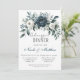 Hochzeitsfeier mit einem blumengeschmückten, marineblauen Kranz in Aquarelltönen mit üppigen Rose und Eukalyptuspflanzen in Marineblau, Grün und Elfenbein. Das Design wird durch eine silbergraue Druckbox unter dem Kranz mit modernem Schriftart-Textlayout ergänzt. Die Rückseite der Einladung setzt das Thema mit einem passenden Blumenarrangement für einen einheitlichen und eleganten Look fort. Ideal für Paare, die eine zeitlose und elegante Hochzeitsreise suchen.