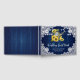 Das Gästebuch ist ein marineblau-rustikales Hochzeitsgast mit einer Wasserdose und Sonnenblumen vor einem Holzboden, der mit weißen Blumenspitzen und Lichtern aus Streichholz geschmückt ist. Dieses Gästebuch eignet sich ideal für eine marineblaue Hochzeitsfeier, die von Sonnenblumenhütten inspiriert wird.