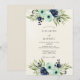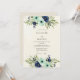 This design features a delicate arrangement of navy blue and seafoam teal anemones clustered with dark indigo berries. Lush sage green foliage and willow leaves accent the top and bottom of the cream-colored background, creating a sophisticated botanical aesthetic. The cool color palette and soft watercolor textures evoke a tranquil and airy mood perfect for a coastal or seaside event.