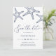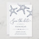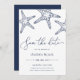 Unsere schicke Hochzeit an der Küste bewahrt die Dattelkarten mit klassischem nautischen Stil und einem gepflegten, eleganten Look und einer leichten Touch des Meereslebens. Das Design umfasst drei marineblaue Sternenbilder, darunter Save the Date Details in einer schicken Kombination aus Serifen und serifenlosen Schriftzeichen. Ideal für Hochzeiten mit Wassersport, Sommer oder Strand.